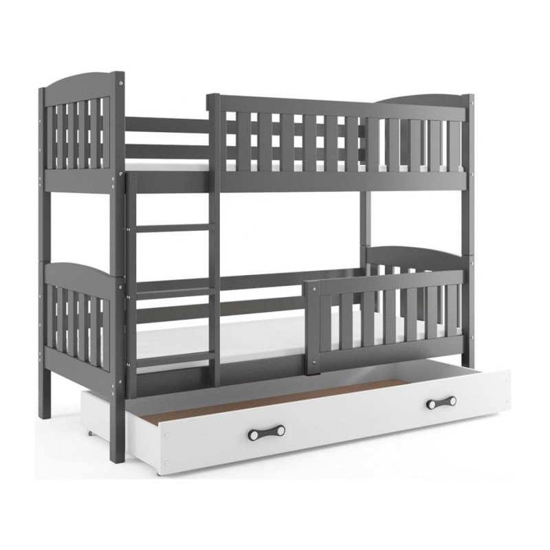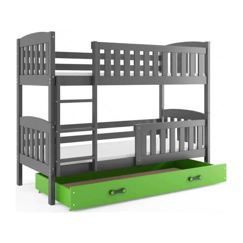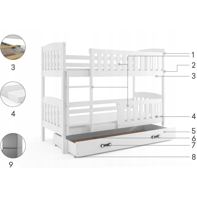 Dětská patrová postel Kubus s úložným prostorem včetně matrací a roštů. Postel obsahuje ochrannou zábranu. S ohledem na děti je veškerý sortiment vyroben ekologicky. Je tedy vyloučeno při kontaktu dítěte s nábytkem požití toxických nebo zdraví škodlivých látek. Žebřík lze namontovat vpravo i vlevo. - Moderní postel vyrobená z masivu borovice. - 100% ochrana pro vaše dítě díky bezpečnostní zábraně. - Rošty vyrobené ze dřeva, z pružinových lamel, které jsou upevněné PVC madlem na kovové liště. - Pěnové matrace, které jsou vysoce hypoalergenní s lehce snímatelným potahem, potah lze prát v pračce. Matrace je univerzální, vzdušná a velmi dobře odvádí vlhkost. Výška matrace je 7 cm. Údržba: Povrch nábytku otírejte vlhčeným hadříkem. Vyhněte se použití chemikálií.