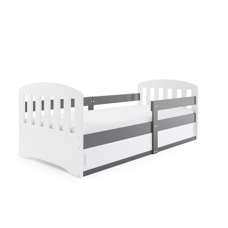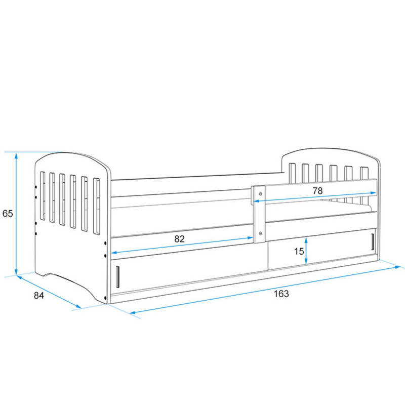 Dětská postel CLASSIC 1. Rám postele je vyrobený z borovicového dřeva. Díky praktickému úložnému prostoru vyřešíte problémy s uschováním všech malých nezbytností. S ohledem na děti je veškerý sortiment vyroben z ekologicky nezávadného materiálu. Úložný prostor nemá dno. - 100% ochrana pro vaše dítě díky bezpečnostní zábraně. - Úložný prostor nemá dno. - Pěnová matrace, která je vysoce hypoalergenní s lehce snímatelným potahem, který lze prát v pračce. Matrace je univerzální, vzdušná a velmi dobře odvádí vlhkost. Výška matrace je 7 cm. Údržba: Povrch nábytku otřete do čista měkkým hadříkem. Vyhněte se použití chemikálií.