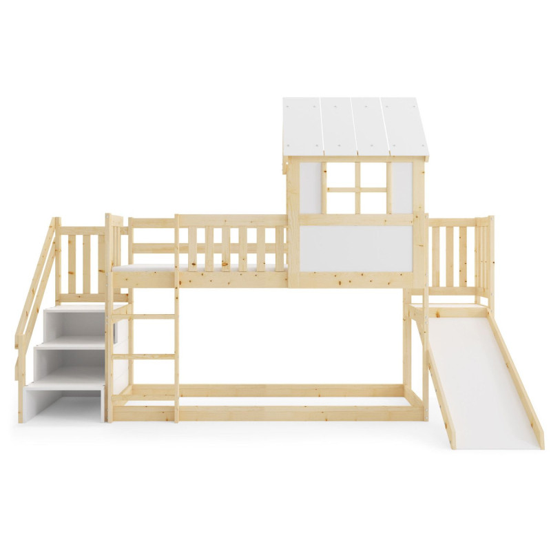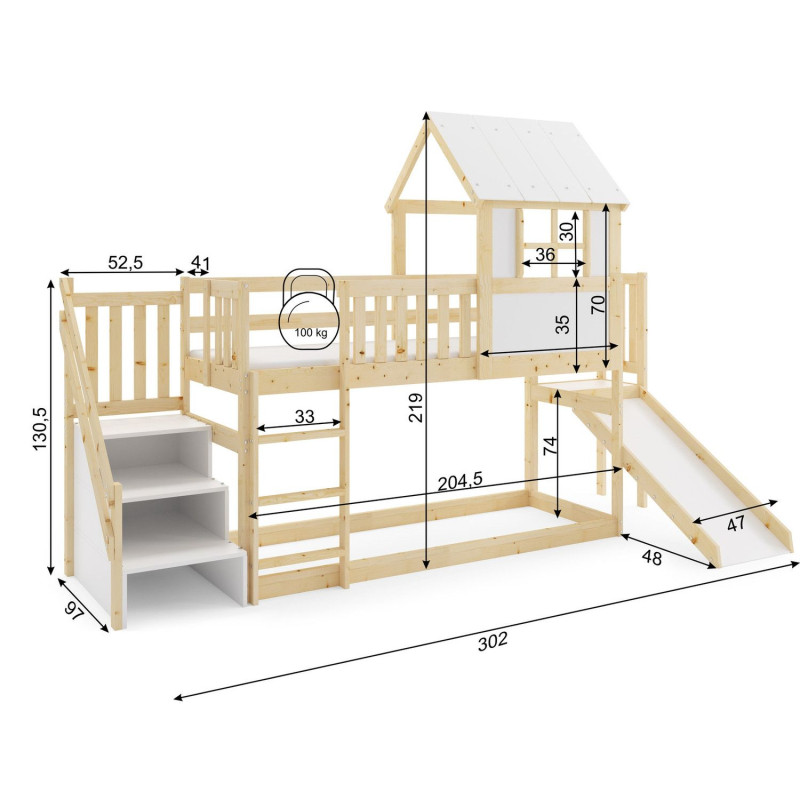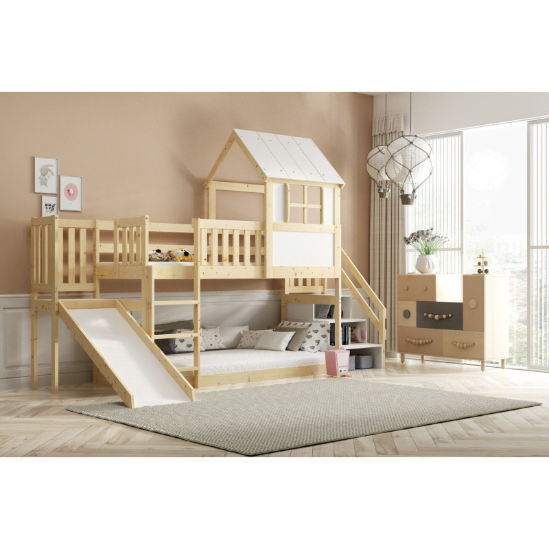 Dětská patrová postel ANTRESOLA se skluzavkou a schůdky 90x200 cm. Dětská postel včetně matrace a roštu. Tento styl postele je oblíbený mezi dětmi, protože přináší kreativitu a nápaditost do jejich pokoje. S ohledem na děti je veškerý sortiment vyroben ekologicky. Je tedy vyloučeno při kontaktu dítěte s nábytkem požití toxických nebo zdraví škodlivých látek. - kvalitní masivní borovice - součástí postele je rošt a matrace - kvalitní zpracovnání Údržba: Povrch nábytku utírejte do čista měkkým hadříkem. Vyhněte se použití chemikálií.