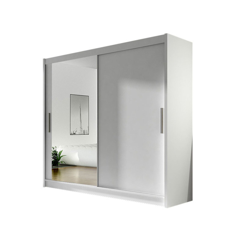 Dvoudveřová šatní skříň se systémem posuvných dveří, která usnadňuje každodenní používání. Moderní, funkční a elegantní. Určeno pro bezpečné uložení oděvů a jiných osobních věcí. Velké zrcadlo, je umístěno pouze na jedné straně čela skříně. - použití kvalitních materiálů - zajímavé provedení - snadná montáž Údržba: Povrch nábytku utřete do čista měkkým hadříkem. Vyhněte se použití chemikálií.