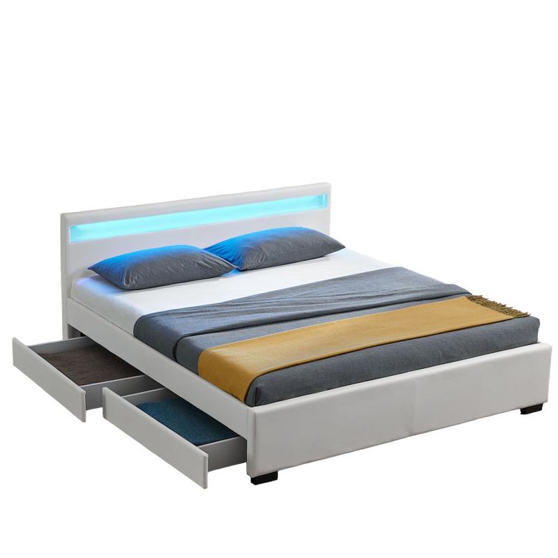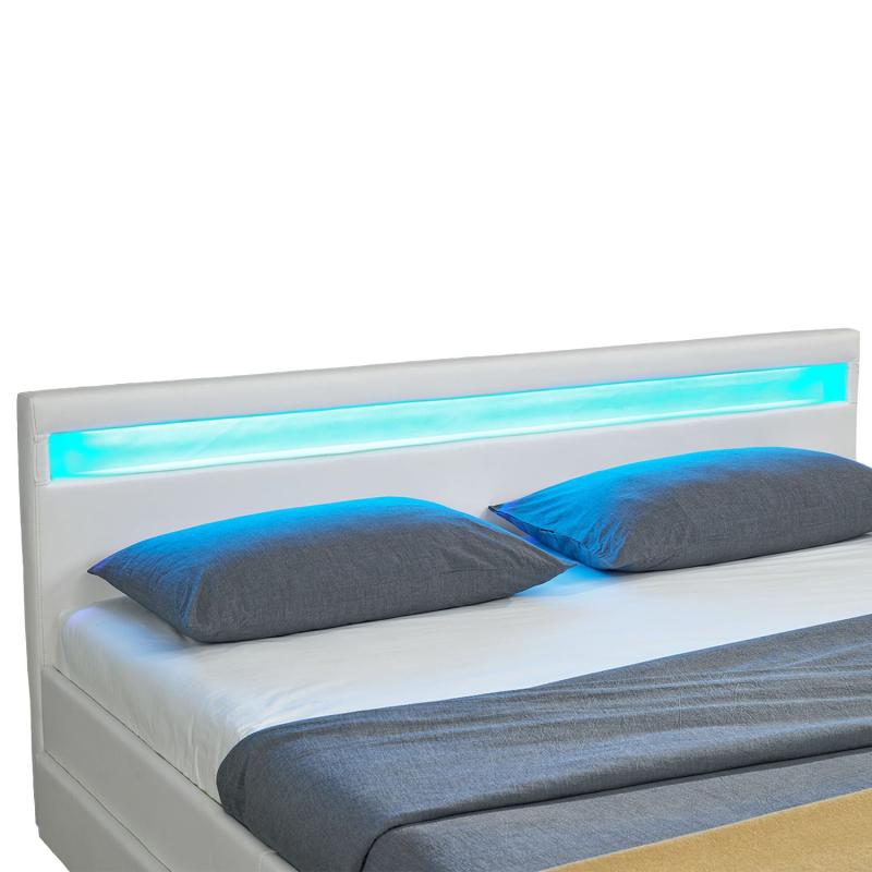 Robustní rám postele 148 x 214 cm vyrobený z MDF dřeva a kovu a bude vás bezpečně a spolehlivě podpírá během spánku. Je mimořádně robustní, má pohodlnou výšku ležení a navíc se snadno montuje. Potah vyrobený z odolné syntetické kůže lze snadno čistit vlhkým hadříkem. Součástí je dvoudílný lamelový rošt s dřevěnými příčkami a konzolovou středovou vzpěrou. Nabízí optimální plochu pro váš matraci o rozměrech 140x200 cm a potěší vás dobrou oporou. To vytváří ideální podmínky pro dobrý spánek. LED pásek zabudovaný do čela postele vytváří v ložnici příjemnou atmosféru. K dispozici je 16 různých nastavení barev, které můžete snadno ovládat dálkovým ovládáním.